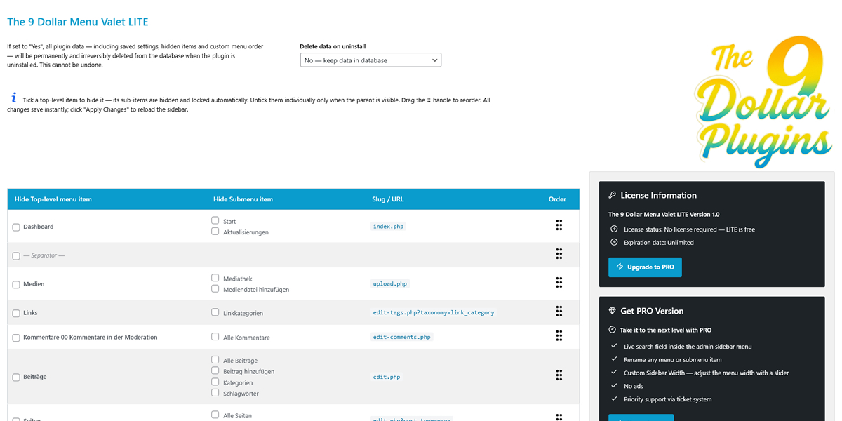 The 9 Dollar Menu Valet is designed for WordPress users who need a straightforward, reliable way to manage their admin menu – without bloat or complex configuration. Unlike bulky admin management plugins, this plugin keeps everything lean, fast and completely under your control.