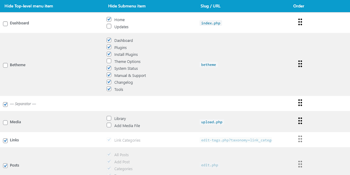 Grab the handle on any row and drag it to the position you want. The new order is saved instantly and applied to the WordPress admin sidebar on the next page load.