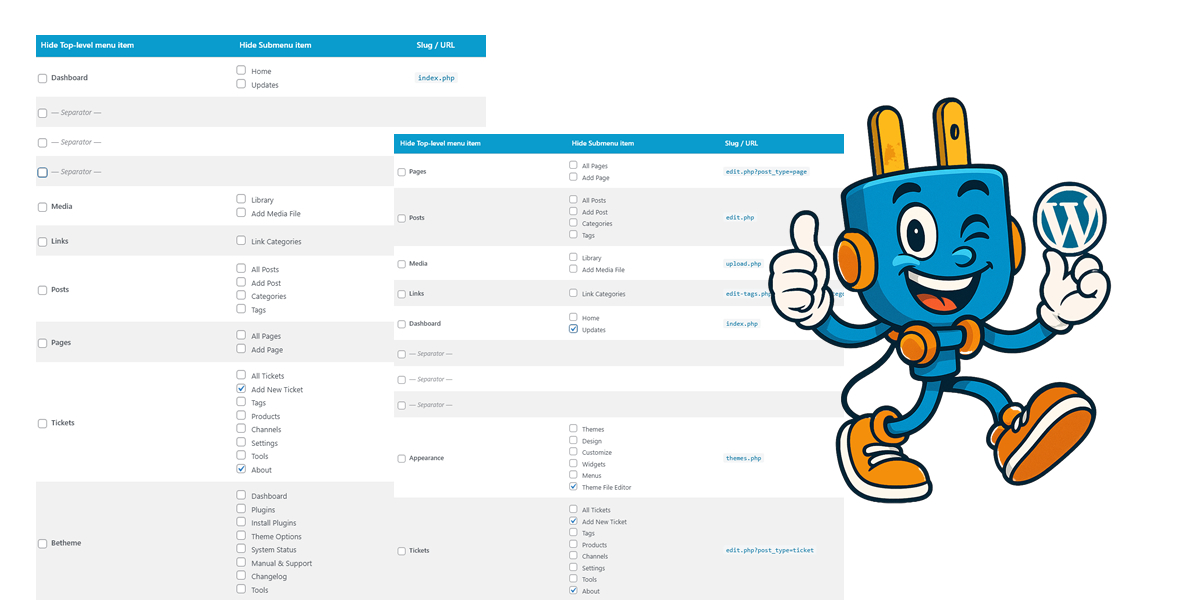 Hide individual submenu entries independently — as long as the parent item is visible. Submenu checkboxes lock automatically when the parent is hidden, preventing conflicts.