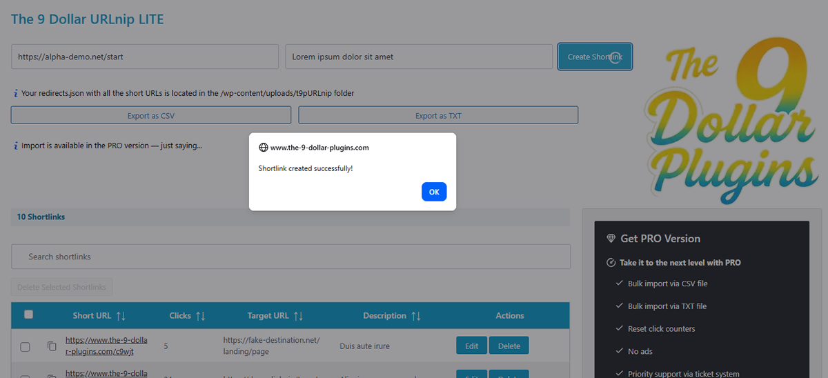 === The 9 Dollar URLnip === Contributors: the9dollarplugins Donate link: https://www.the-9-dollar-plugins.com Tags: url shortener, shortlink, redirect, link shortener, short url Requires at least: 5.5 Tested up to: 6.9 Requires PHP: 7.4 Stable tag: 1.1 License: GPLv2 or later License URI: https://www.gnu.org/licenses/gpl-2.0.html Create clean shortlinks in WordPress. Lightweight URL shortener with simple redirect management. == Description == The 9 Dollar URLnip is minimal, fast and reliable. Shortlinks live under your own domain, data is stored in a single JSON file — no database overhead, no bloat, no hassle. **Core Features** - Create, edit and delete shortlinks directly in the WordPress admin - Automatic 301 redirects with unique 5-character alphanumeric slugs - Click counter — every visit increments automatically - Export all shortlinks as CSV or TXT (including click counts) - Live search with real-time filtering and dynamic count display - Sortable columns — Short URL, Clicks, Target URL, Description - One-click copy to clipboard - Bulk delete selected shortlinks - Shortlinks are stored in a JSON file, faster than database queries — keeping the database clean - Fully translatable and WordPress.org compliant = How It Works = 1. Install and activate the plugin 2. Go to "URLnip" in your WordPress admin menu 3. Enter a target URL and an optional description 4. Get your shortlink instantly and track clicks from one place == Screenshots == 1. Create shortlinks directly inside WordPress 2. Manage all shortlinks in one place 3. Clean short URLs for your website == Installation == 1. Upload the plugin to `/wp-content/plugins/` or install it directly via the WordPress plugins screen. 2. Activate the plugin through the Plugins screen. 3. Open the URLnip page in your WordPress admin menu. 4. Add your target URL and get your shortlink instantly. == Frequently Asked Questions == = What is the difference between LITE and PRO? = LITE covers all core features: create, edit, delete, export, live search, click counting and bulk delete. PRO adds bulk import via CSV/TXT, reset of click counters and priority support. = Can I customize the shortlink slug? = No, slugs are auto-generated. Each slug is a unique 5-character alphanumeric string. = Where are the links stored? = In a JSON file inside `/wp-content/uploads/t9pURLnip/`. The directory is protected with .htaccess rules that block direct web access. = Is this GDPR compliant? = Yes. The plugin stores only shortlink data (URLs, descriptions, click counts) on your own server. No personal user data, no cookies, no tracking. = Can I import existing shortlinks? = Yes — with PRO. Bulk import via CSV and TXT is supported. Invalid rows are automatically skipped and reported. Example files are available directly in the plugin admin page. = Can I reset the click counter? = Yes — with PRO. Reset individual counters or use the bulk action to reset multiple at once. = How many links can it handle? = The JSON format works well with 100,000+ links without performance issues. = What happens if I deactivate the plugin? = Shortlinks stop working, but your data file remains in `/wp-content/uploads/t9pURLnip/`. Reactivate and everything is back instantly. = Can I use this for affiliate links? = Yes, any valid URL works — including affiliate links. == Changelog == = 1.1 - 2026-03-11 = - Fixed design issues - Optimized code for better performance - Added license information / license box = 1.0 - 2026-02-22 = Initial release. Full feature set including inline editing, click counter, live search, sortable columns, bulk delete and one-click copy.